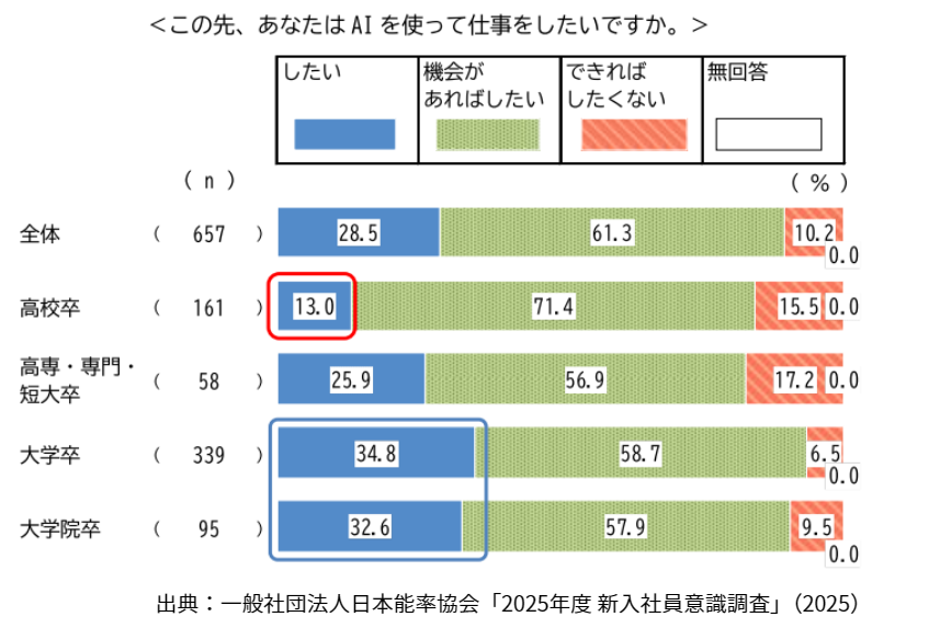 一般社団法人日本能率協会の調査では、「AIを使って仕事をしたいですか」という質問が行われました。その結果、高卒者の15.5%が「できればしたくない」と回答しています。一方で、「(積極的に)使って仕事をしたい」と答えた割合は13.0%にとどまり、大卒の34.8%、高専・専門・短大卒の25.9%と比べて大きく下回る結果となりました。高卒者の間では、AIに対する心理的なハードルや、業務で活用することへの不安感が相対的に高いことがうかがえます。