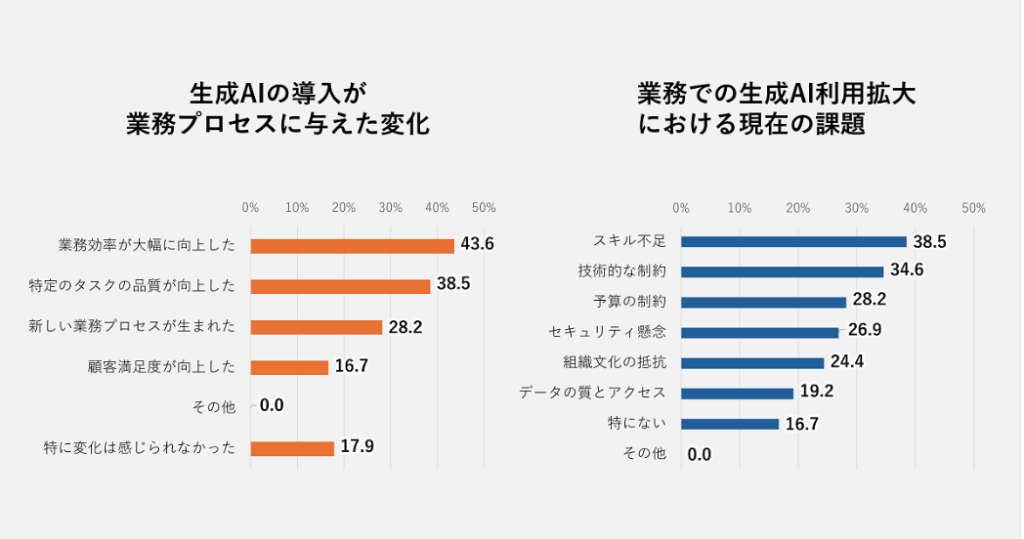 一方で、生成AI活用における課題としては、「スキル不足」「技術的な制約」「予算の制約」 が挙げられており、特に「スキル不足」が38.5%で最も多い回答となっています。