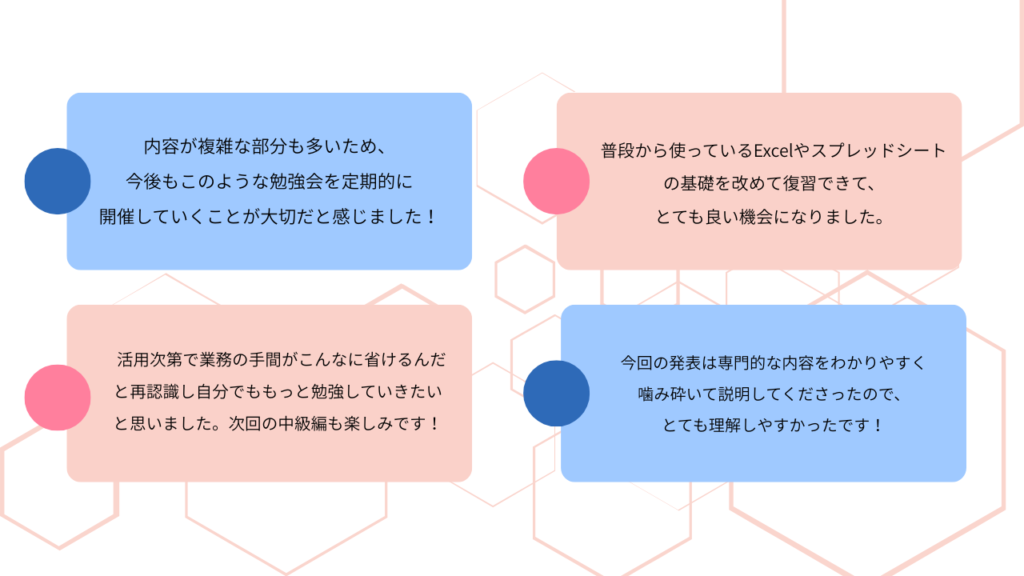 特に関数編では、「これ、明日から使える!」という声があちこちから聞こえ、実践的で盛り上がる時間となりました。